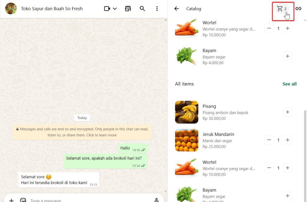 Saat chat anatara Anda dengan pelanggan sedang berlangsung, bisnis bisa membagikan daftar—berisi maksimum 30 item yang ada di katalognya—yang sesuai dengan pertanyaan atau permintaan tertentu. Ini bisa mempermudah pelanggan mencari item yang diinginkan.