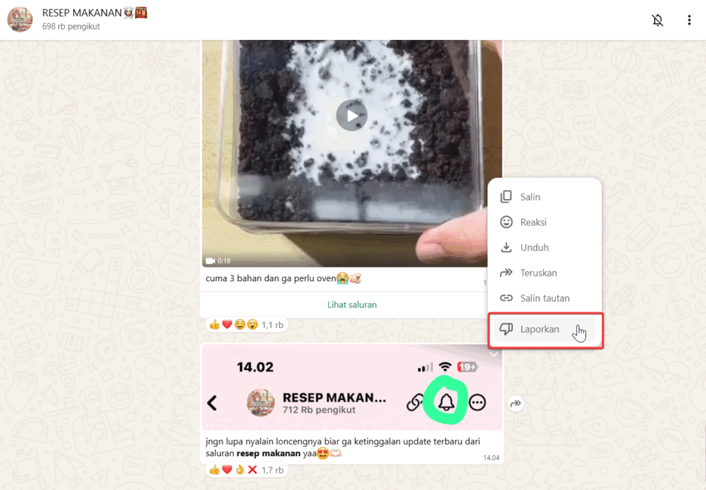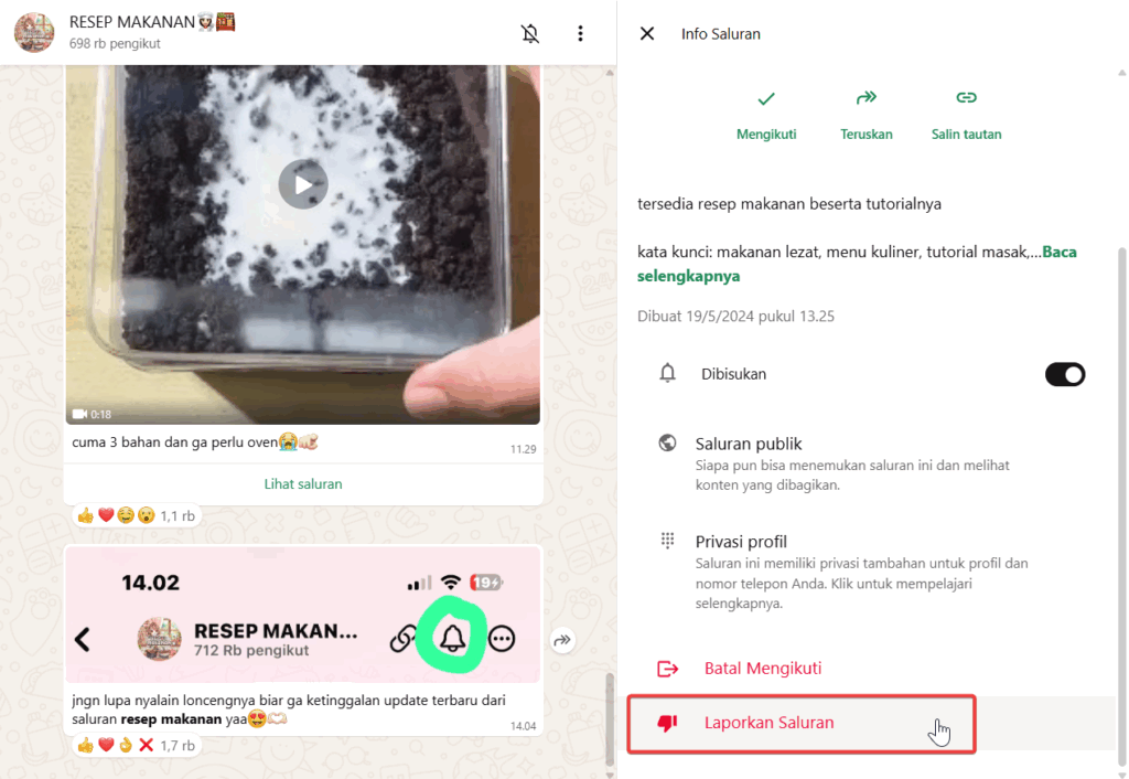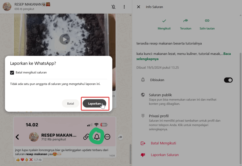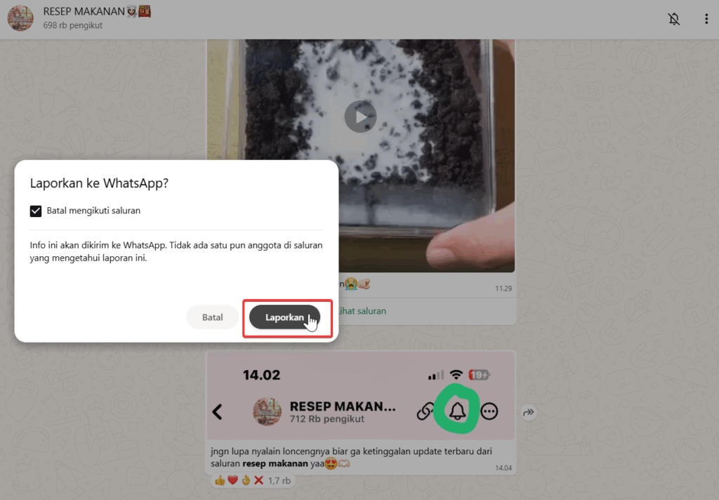 Untuk melacak status laporan, klik > Bantuan > Laporan saluran. Tinjauan yang sedang diproses akan dilabeli Laporan sedang ditinjau. Tinjauan yang sudah selesai akan dilabeli Laporan sudah ditinjau. Klik laporan untuk melihat keputusan WhatsApp. Peninjauan laporan biasanya memerlukan waktu 24 jam. Tidak seorang pun di saluran yang akan mengetahui laporan ini, bahkan admin tidak akan diberi tahu mengenai permintaan Anda. Setelah terkirim, laporan tidak bisa dibatalkan. Jika konten yang dilaporkan tidak melanggar Pedoman Saluran, saluran tidak akan terpengaruh.