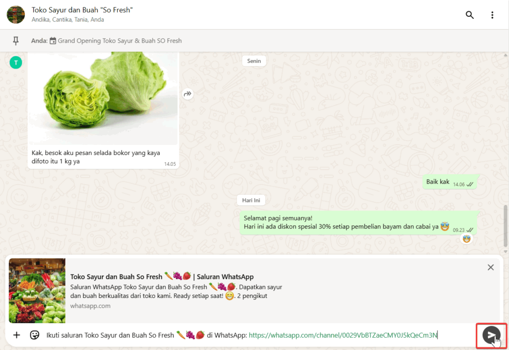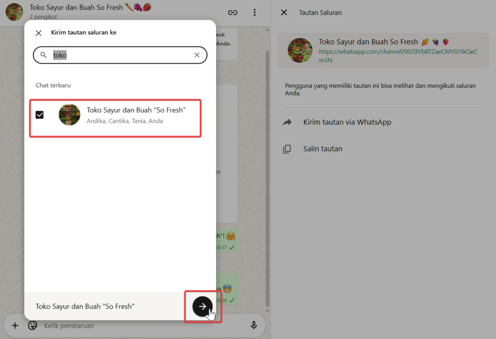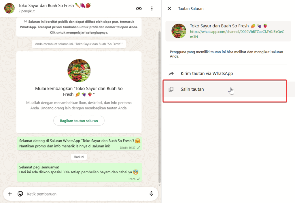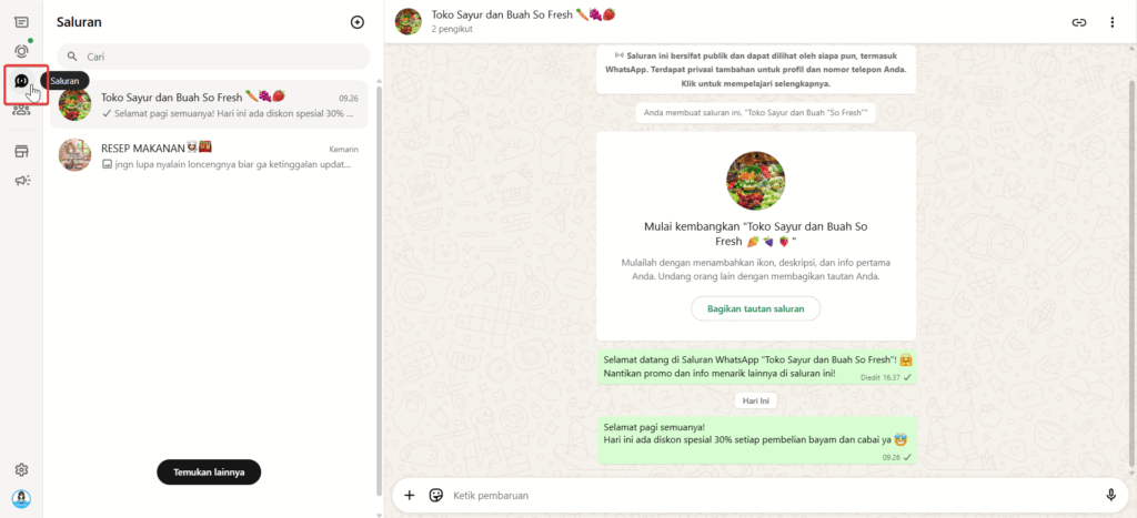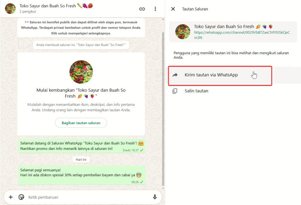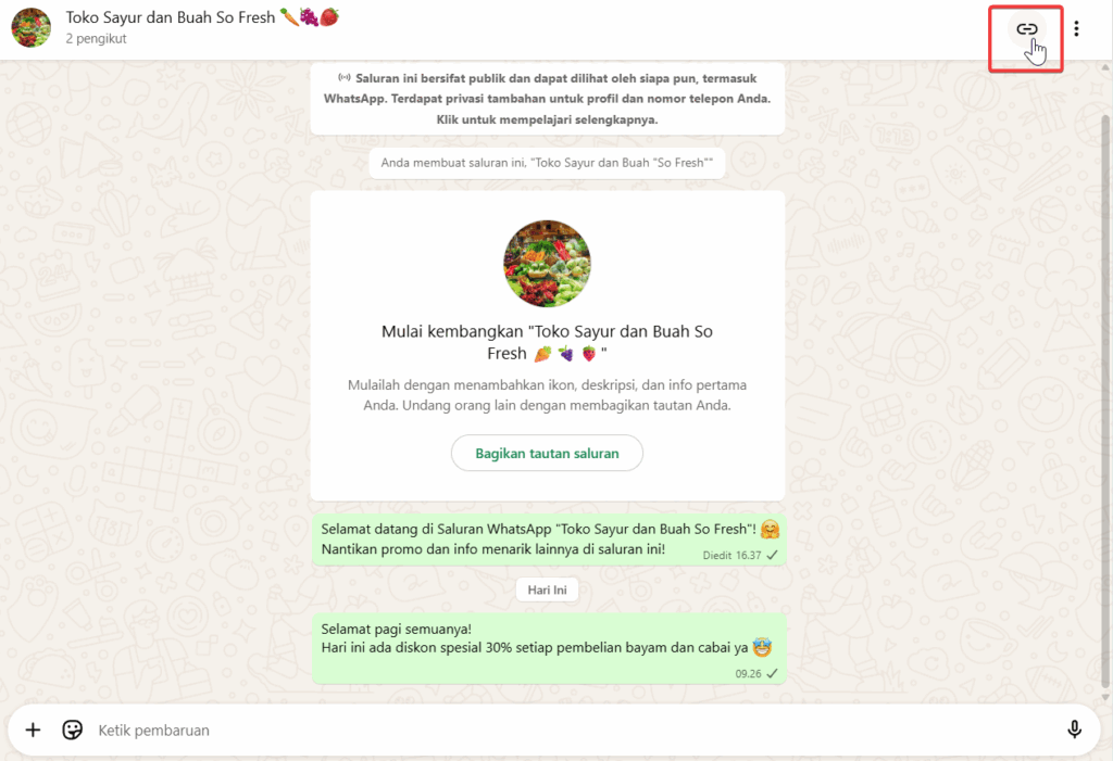Saluran yang Anda kelola memiliki tauran dan kode QR yang tertaut pada saluran Anda dan bisa dibagikan ke chat, status, dan aplikasi lainnya.