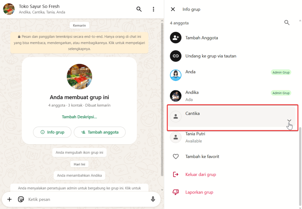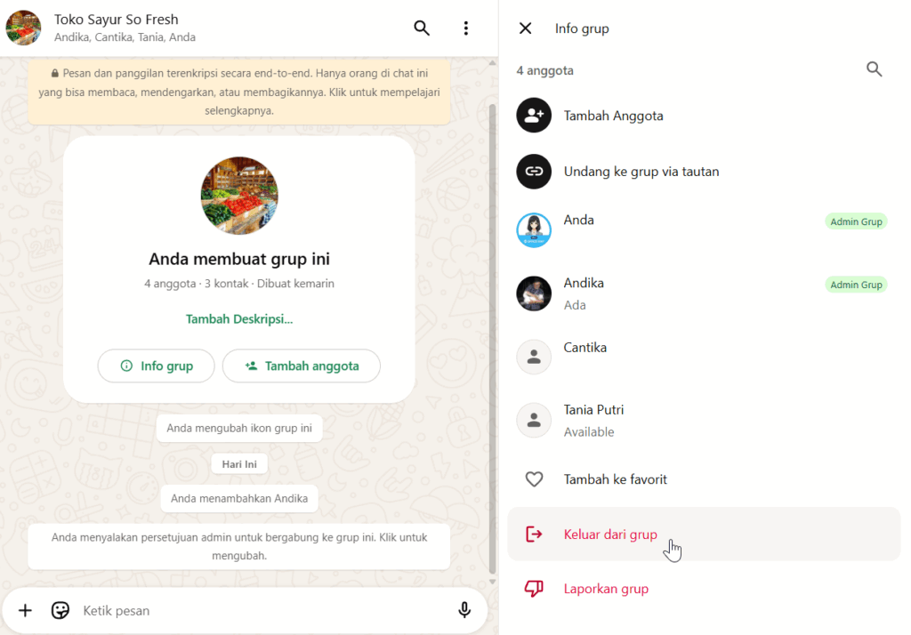 - Keluar dari grup: Keluar dari grup dengan tetap menyimpan riwayat chat.