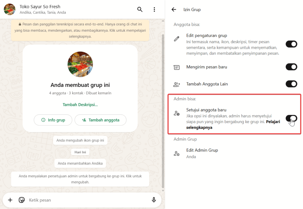 • Ketika dinyalakan, admin harus menyetujui siapa saja yang ingin bergabung ke grup.