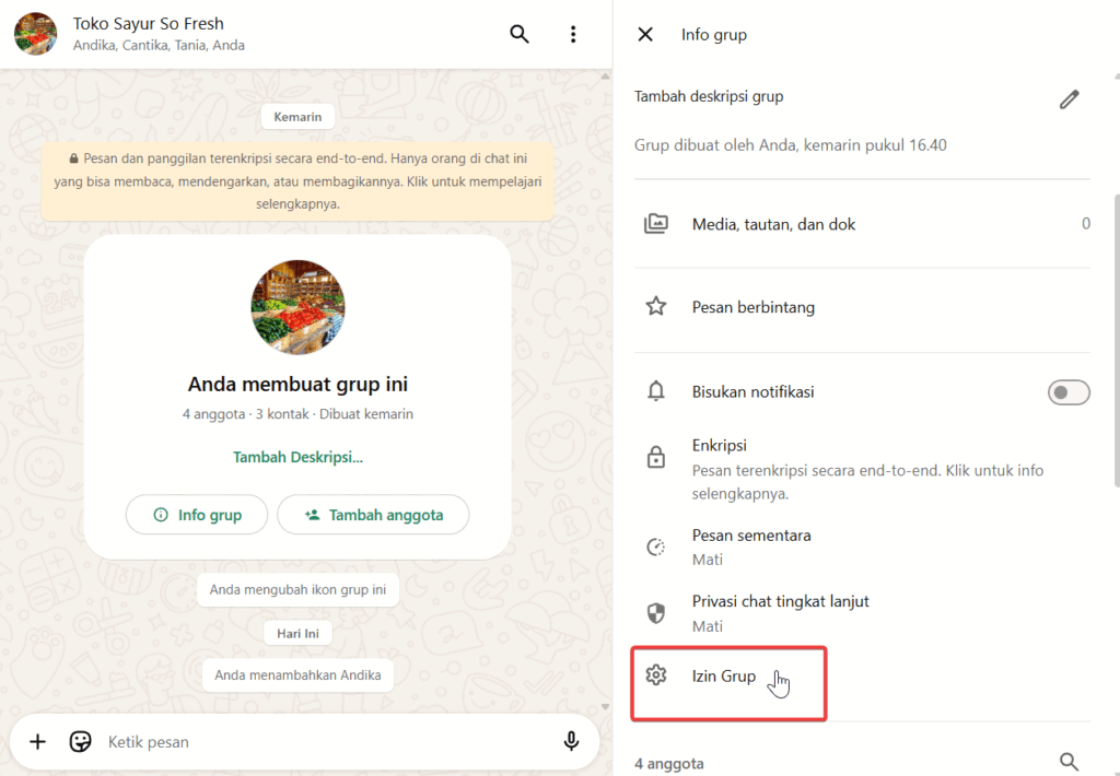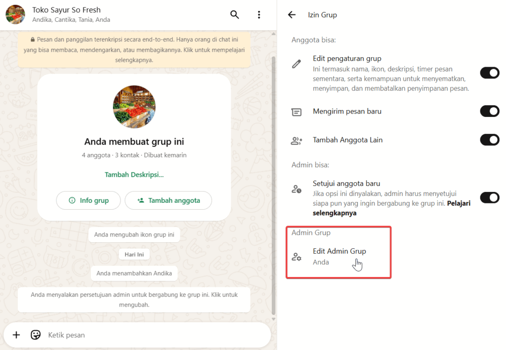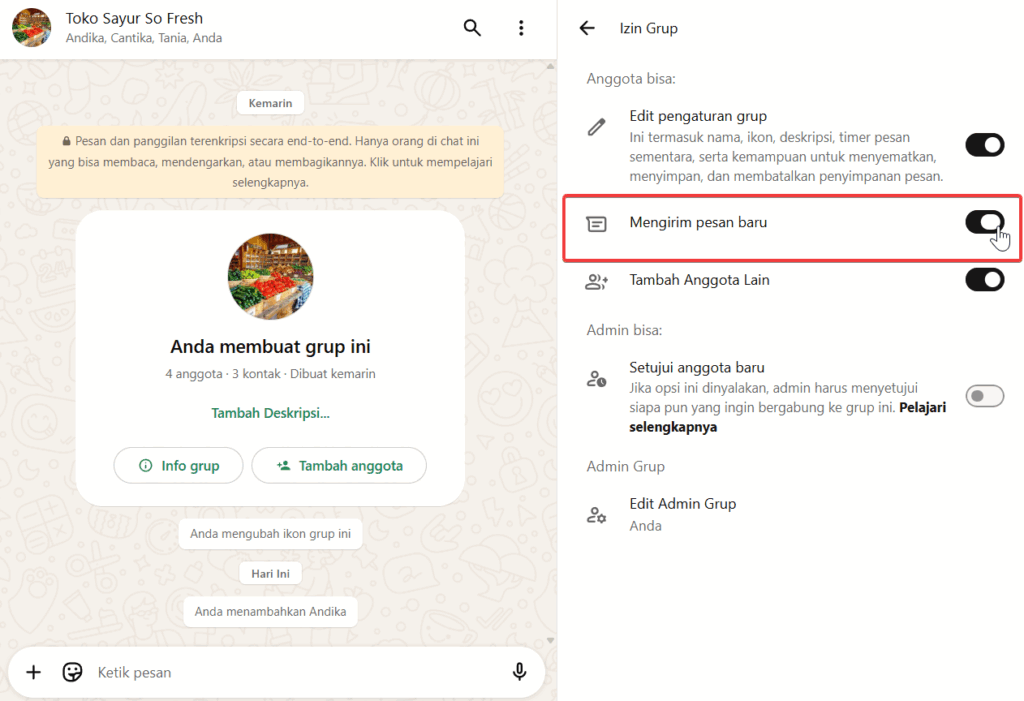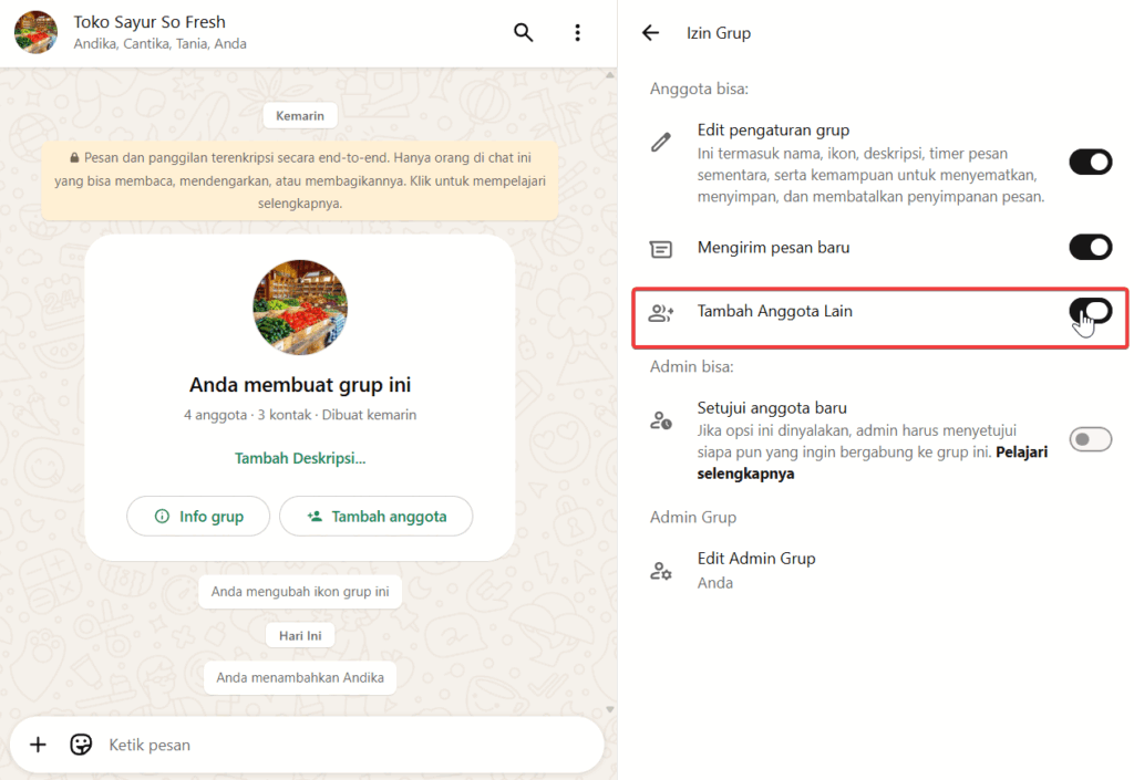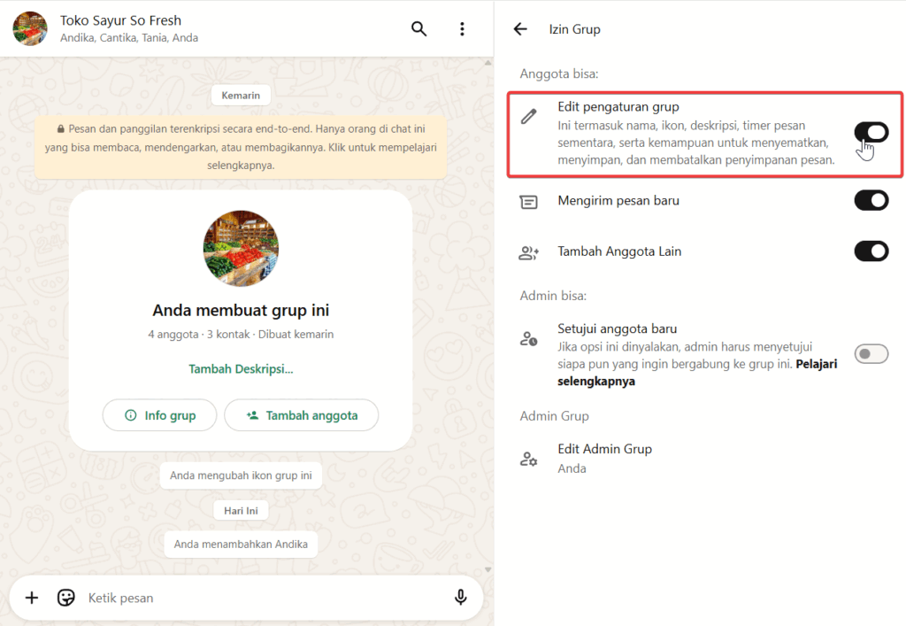 Admin grup bisa mengubah pengaturan untuk mengizinkan hanya admin atau semua anggota yang bisa mengedit info grup, mengirim pesan, atau menambahkan pengguna lain ke grup.