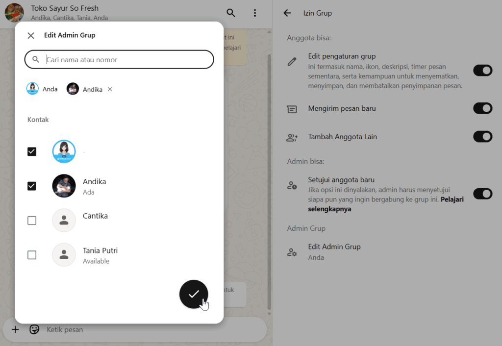 1. Pilih anggota lain di grup yang bisa menjadi admin grup kemudian klik Tanda centang (tanda centang di dalam persegi)