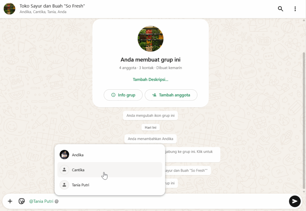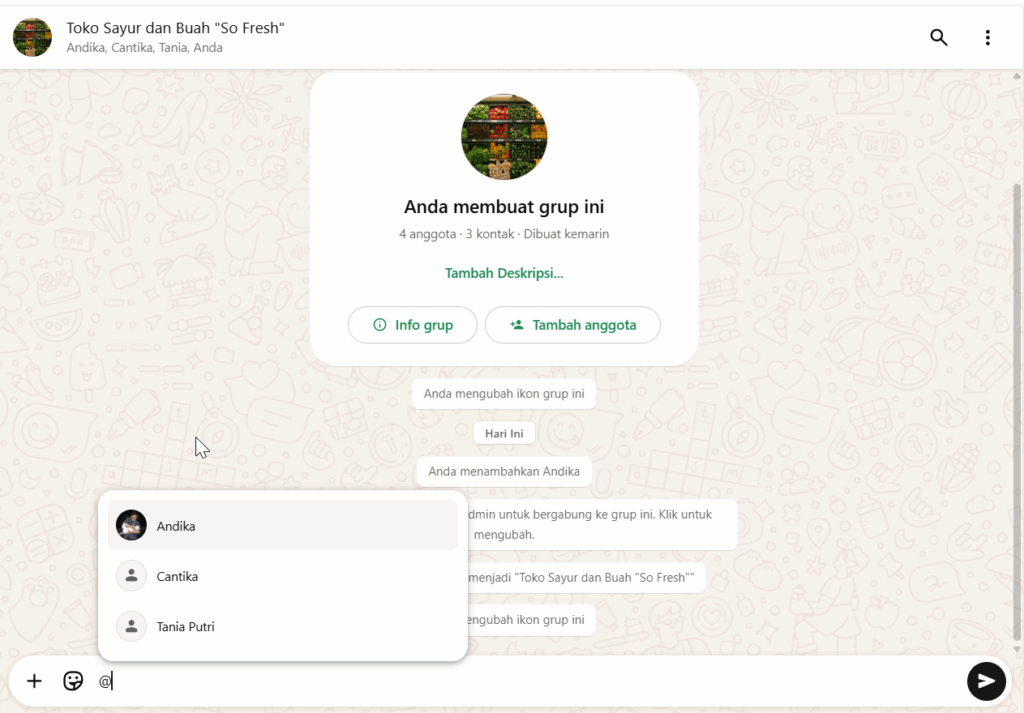 Jika Anda berada dalam grup yang sama dengan seseorang, Anda bisa menyebutnya di pesan dengan mengetik @, lalu memilih namanya. Pengguna tersebut akan melihat ikon @ di samping pesan yang belum dibaca di dalam daftar chat dan bisa dengan cepat mencapai ke pesan yang menyebutnya atau pesannya yang dibalas.