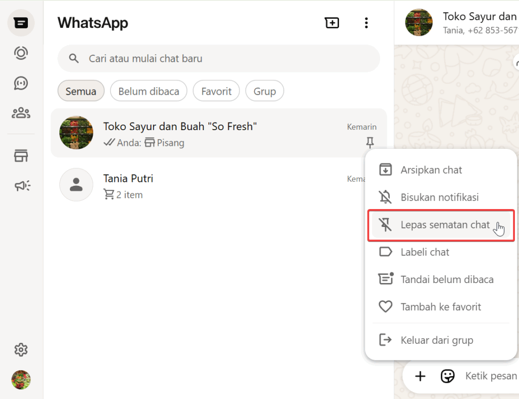 Cara Melepas Sematan ChatOleh Office Map / 08/28/2025 Berikut merupakan cara melepas sematan chat: Klik obrolan yang ingin dilepaskan sematannya, lalu klik yang berada di kiri baris obrolan Lalu pilih menu Lepaskan Sematan Chat