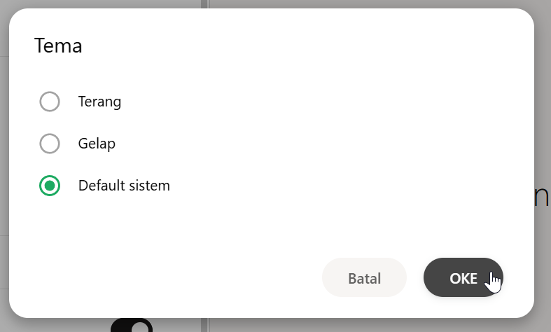 - Kemudian Anda bisa mengatur tema yang anda inginkan baik gelap atau terang. Kemudian klik OKE