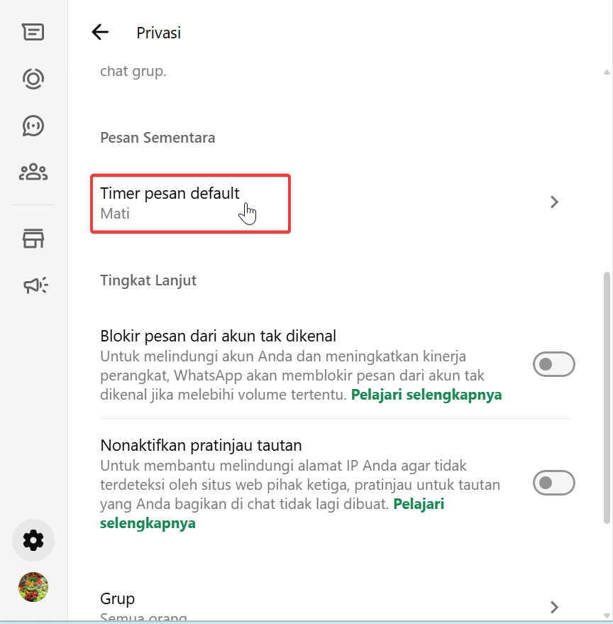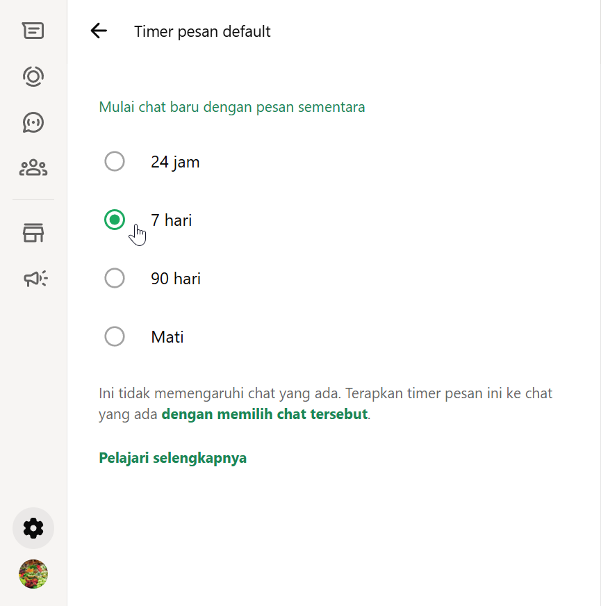 Fitur pesan semetara pada WhatsApp berguna untuk meningkatkan privasi, menghemat ruang penyimpanan, dan membatasi keberadaan obrolan yang tidak perlu dengan cara menghapus pesan secara otomatis setelah durasi waktu tertentu (24 jam, 7 hari, atau 90 hari). Berikut merupakan langkah-langkah untuk mengatur Fitur Sementara secara default: